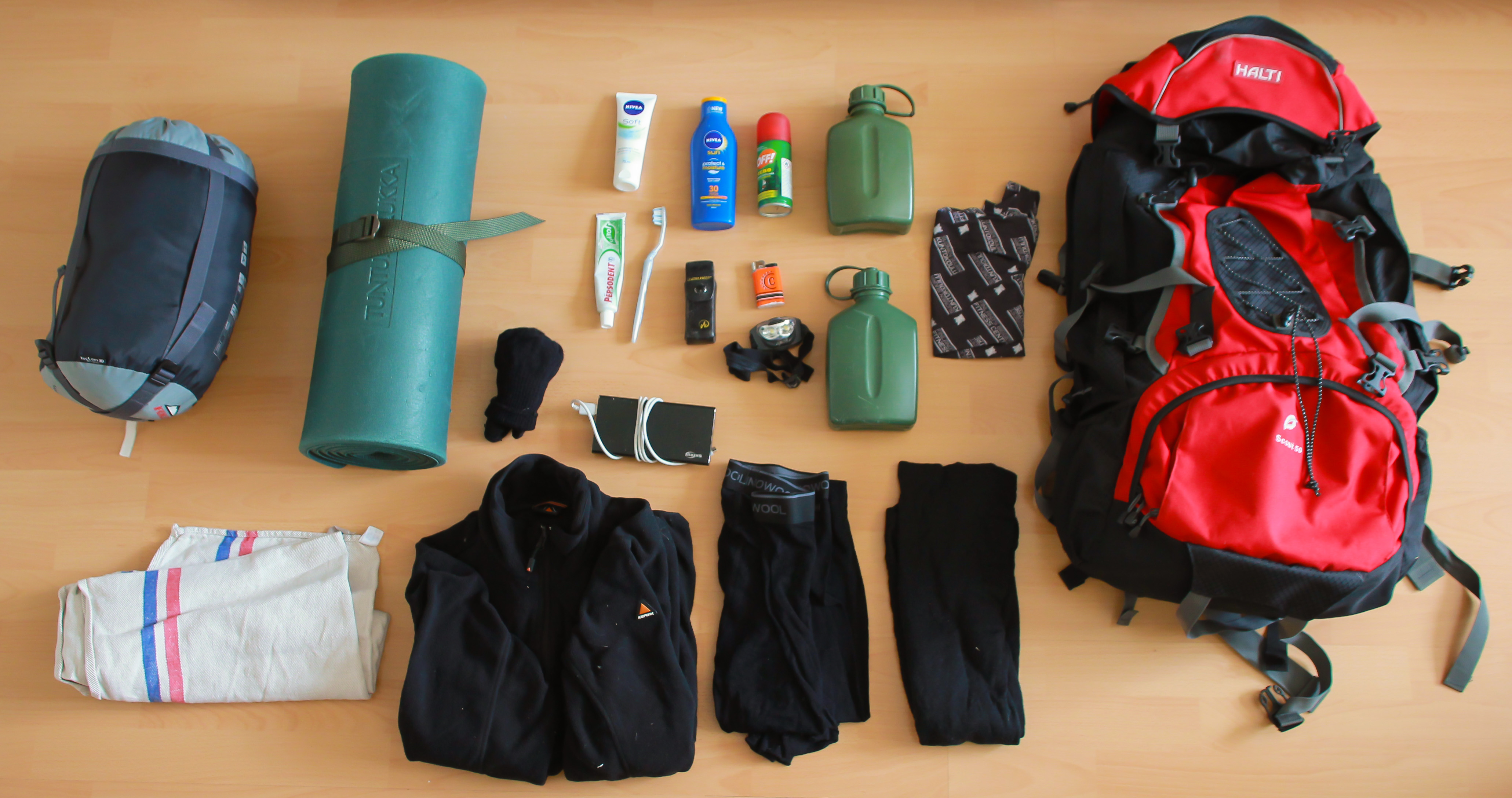 Partioajoilta minulla oli rinkka, makuupussi ja makuualusta. Näissä kaikissa oli tosin se huono puoli, että ne ovat vuosikymmen sitten eläneen itseni kokoisia: makuupussi on itsensä mukaan korkeintaan 175 cm pitkille ja rinkka on Haltian Junior-sarjaa ja tilavuudeltaan vain 50 litraa. Päätin kuitenkin pärjätä näillä: makuupussissani olen viime vuosina mahtunut hyvin nukkumaan, ja rinkka saa luvan kelvata – enpä ainakaan pakkaa liikaa kannettavaa mukaan.