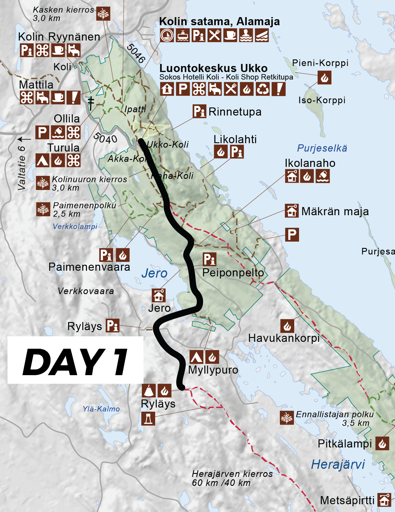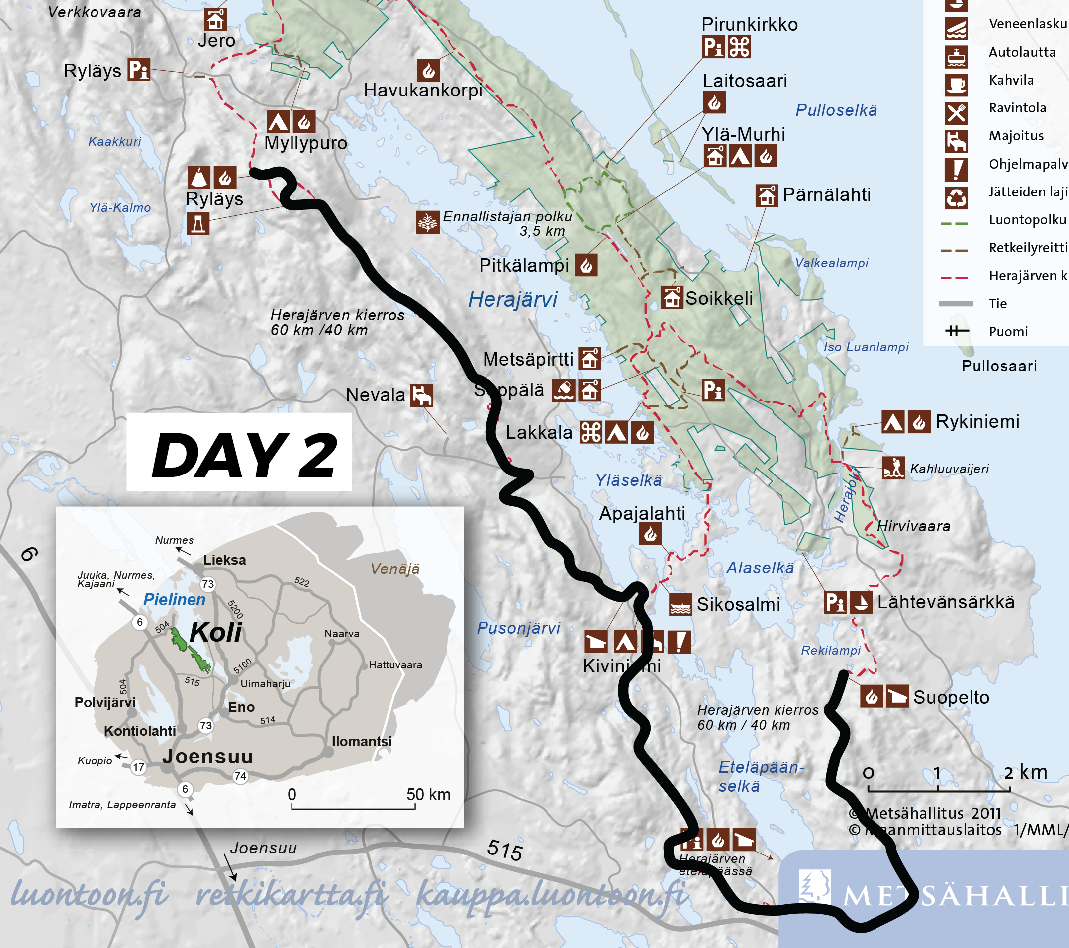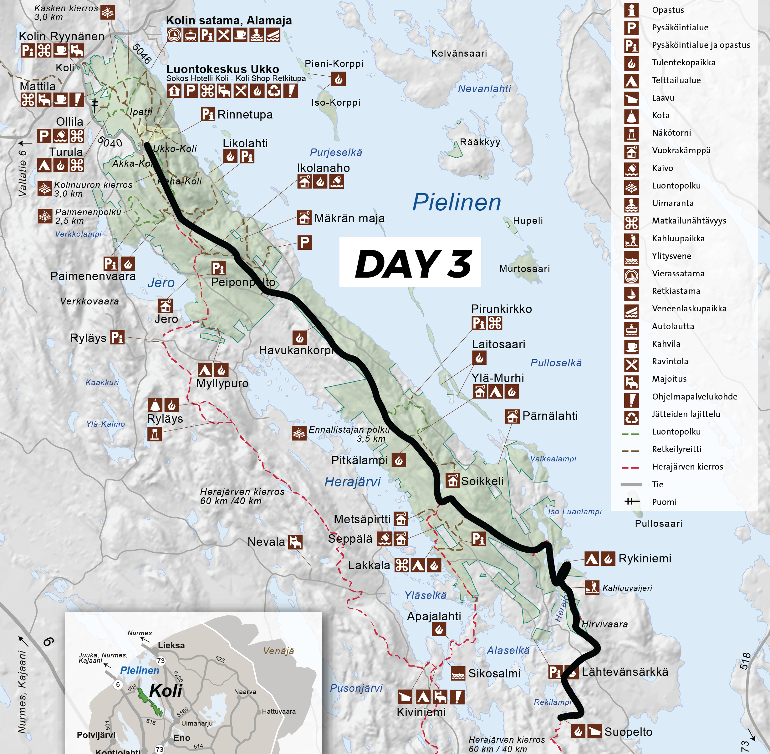 Oma seikkailuni ei kuitenkaan päättynyt tähän – olin saapunut takaisin Kolin huipulle noin tuntia viimeisen kimppataksiyhteyden lähtemistä Joensuuhun. Mitään sen enempää julkista liikennettä Kolilta ei ole, joten minun piti jäädä vielä yhdeksi yöksi Kolin suunnille pyörimään. Kävelin siis yöksi lähimmälle telttailualueelle Turulaan, jossa ehdin jopa viettää iltaa puolalaisten reppureissaajien kanssa iltanuotion äärellä.