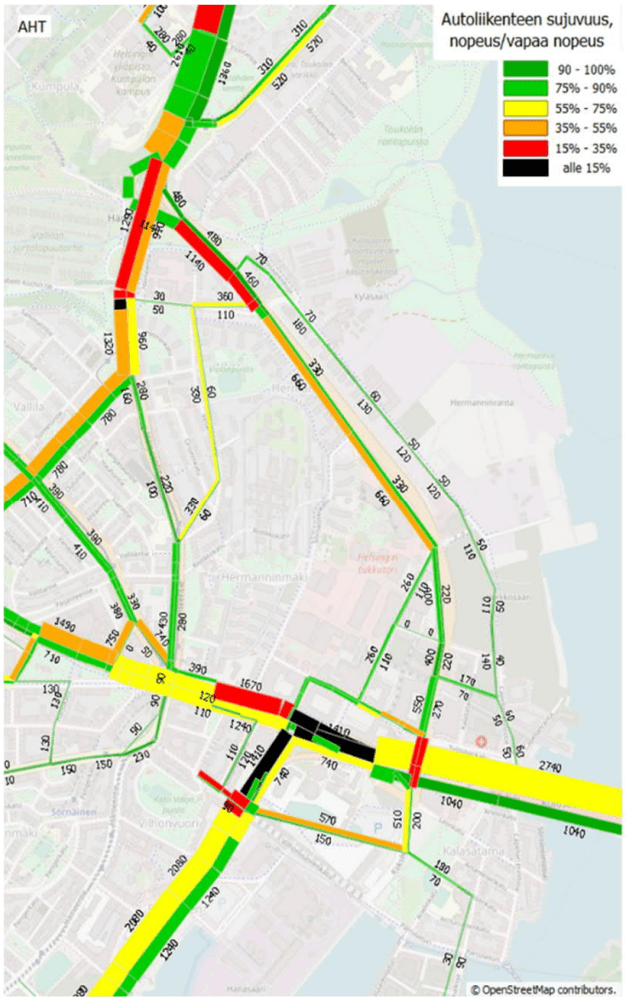 Kuva tarkoittaa sitä, että autoliikenne Itäväylällä Redin edustalta Sörnäisten rantatiehen päähän ja siltaa pitkin Sörnäisten rantatien ja Vilhonvuorenkadun liittymään kulkisi keskimäärin alle 10 km/h -nopeudella autoliikenteen ruuhkautumisen takia. Toisin sanoen kadut pystyvät välittämään kaikki autot alueen läpi, vaikka siinä kestää tavallista kauemmin.