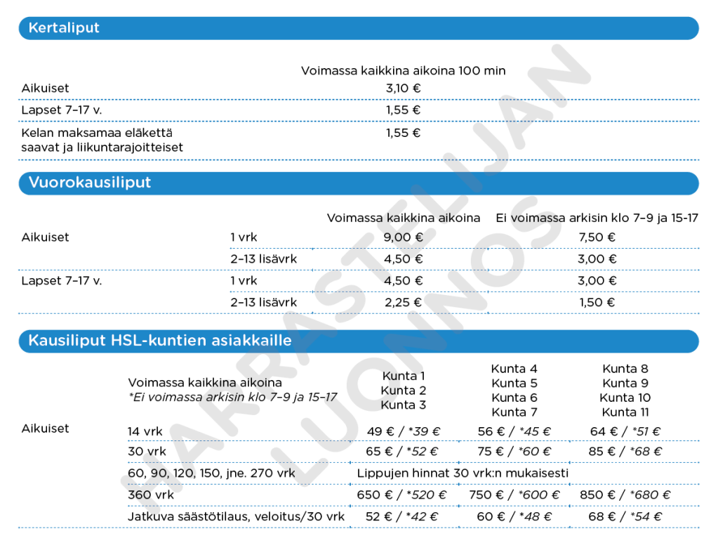 HSL on viime aikoina selvittänyt vaihtoehtoisia lipputuotteita ja hinnoittelumalleja. Tällä blogilla lähetän omat terveiseni HSL:lle siitä, millaisen hinnoittelumallin suuntaan HSL:n tulisi edetä. ”Uusina” ajatuksina peräänkuuluttaisin kuntakohtaisia kausilippujen hintoja ja ruuhka-ajan kalliimpaa hinnoittelua. Lopuksi väitän, että kaupunkiliikenteessä ei tulisi periä kalliimpaa hintaa pidemmistä matkoista kuin lyhyemmistä.