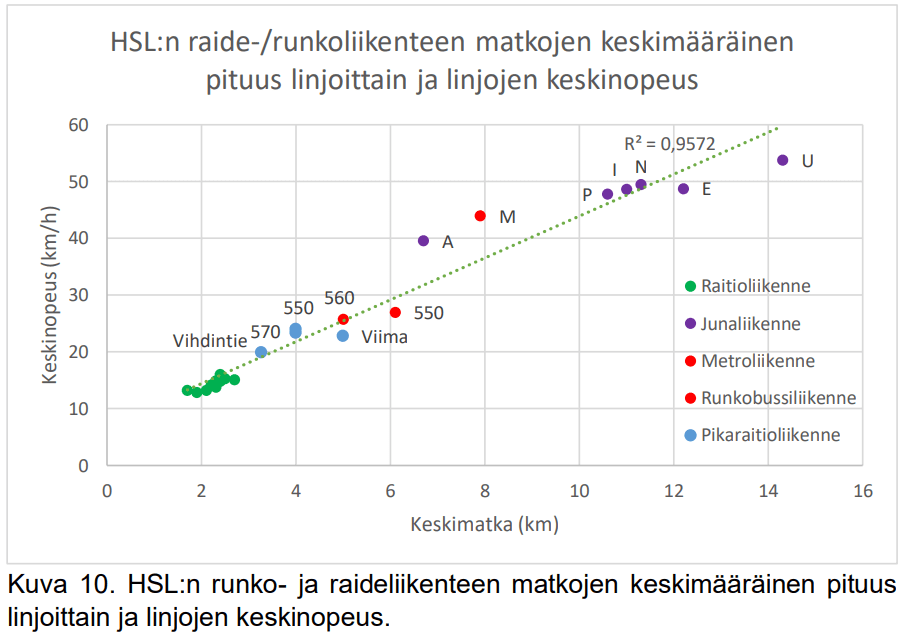 Omassa diplomityössäni havaitsin, että HSL-liikenteessä ihmiset matkustavat kullakin liikennevälineellä keskimäärin 5-6 pysäkkiväliä, joka on noin 10-15 minuuttia. Keskimääräisen joukkoliikennematkan pituus on yksinkertaisesti seuraus siitä, kuinka tihäesti pysäkkejä on. Kaupunkiratikoilla keskimääräinen matka on pituudeltaan 2 km ja U-junalla 15 km, vaikka molemmilla matkan kesto on sama.