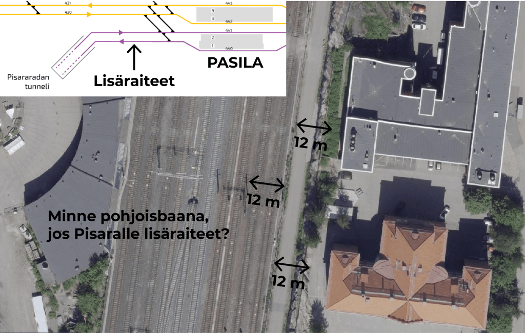 Yksi hyvin vähälle huomiolle jäänyt Pisaran haitta on, että Pisara uhkaisi jyrätä alleen nykyisen pohjoisbaanan. Pisara+-selvityksessä ehdotettiin, että Pisaran parantamiseksi Pasilan aseman eteläpuolelle lisättäisiin kaksi uutta raidetta radan itäpuolelle. Lisäraiteet ulottuisivat Pasilan asemalta Alppipuistoon asti. Minun tekisi mieli kysyä, että mihin ihmeeseen nämä raiteet on suunniteltu mahdutettavan Pasilan peruskoulun kohdalla? En ole nähnyt yhtäkään uskottavaa kuvaa siitä, miten nykyinen pyöräbaana- ja jalankulkuyhteys voisi säilyä nykyisellä paikallaan. Tila loppuu herkästi kesken.