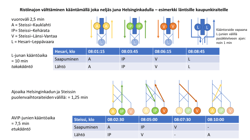 Parhaimmillaan Helsinginkadun asema voisi jopa mahdollistaa 2,5 minuutin vuorovälin kaupunkiraiteille myös Steissin kannalta. Ongelmana on se, että Steissillä käännettäessä junia kolmella laiturilla joka kolmannen junan kulkutiet risteävät. Tämä vaatii junaliikenteen ohjausjärjestelmiltä aika paljon. Yksi tapa välttää nämä ongelmat olisi kääntää joka neljäs juna jo Helsinginkadun aseman eteläpuolelle tehtävällä kääntöraiteella. Matkustajanäkökulmasta ratkaisu on toki huono, sillä parhaimmassa tapauksessa kaikki junat jatkaisivat Steissille. Toivon siis, että tekeillä olevassa Helsinki-Pasila -kapasiteettiselvityksessä löydetään toimiva ratkaisu ristiinajolle!