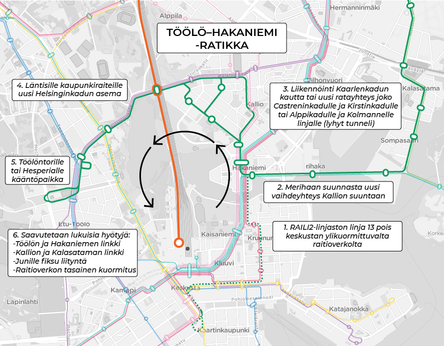 Tämä raitiotie olisi olennaista toteuttaa viimeistään Helsinginkadun aseman toteutuessa. Töölö–Hakaniemi-raitiotie vahvistaisi Töölön ja aseman välisiä yhteyksiä sekä toisi aseman yhden ratikkamatkan päähän Hakaniemestä, Merihaasta, Nihdistä ja laajasta osasta Kalliota. Helsinginkadun asemalla ja Töölö–Hakaniemi-raitiotiellä saataiisin parannettua junaliikenteen ja Hakaniemen sekä Töölön välistä yhteyttä valtavasti vain murto-osalla Pisaran hinnasta.