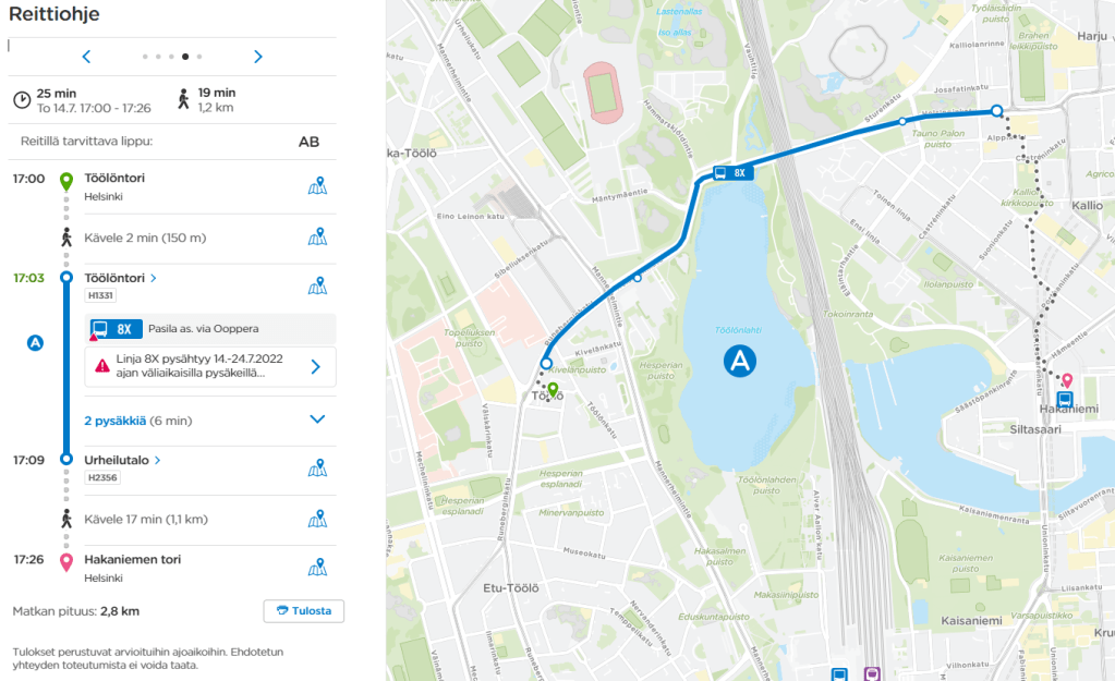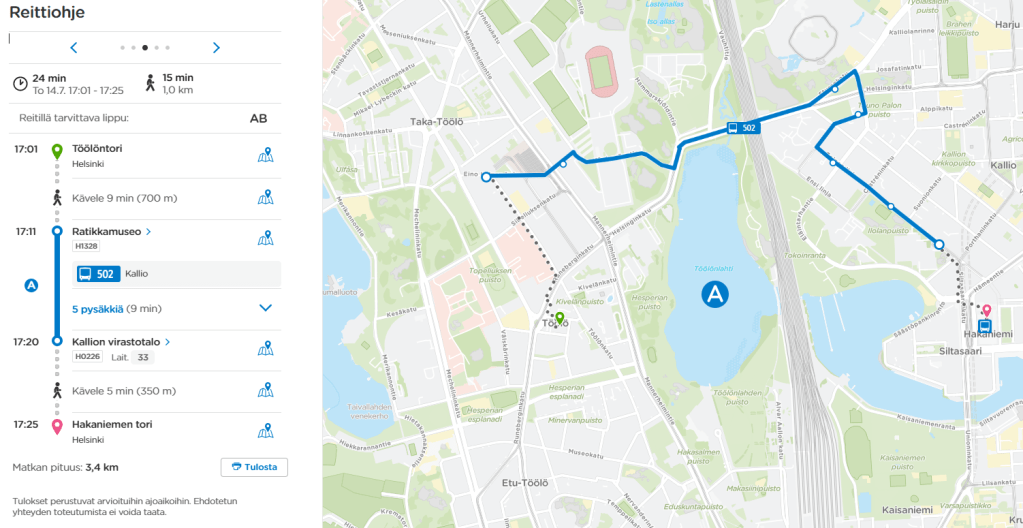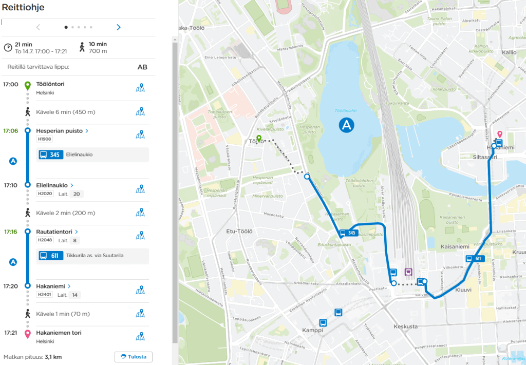 Edellä kuvatut matkustustavat Töölön ja Hakaniemen välillä ovat luokattoman huonoja siihen nähden, että linnuntietä Töölöntorilta on Hakaniemen torille vain puolitoista kilometriä. Kun joukkoliikennematkat kestävät nykyisin tällä välillä yli 20 min, keskinopeus on alle 5 km/h – siis kävelyvauhtia! Etäisyys onkin niin lyhyt, että joukkoliikenteen sijaan matka olisi parempi tehdä kävellen tai pyöräillen. Valitettavasti kaupunginosien välillä on kaksi lahtea ja rautatie, jolloin kävelyreitti muodostuu turhan pitkäksi (yli 2 km) ja mäkiseksi (yli 12 m ylämäki). Tätä kävely-yhteyttä olisi toki mahdollista parantaa uusilla silloilla. Uusista kävelysilloista huolimatta on kuitenkin selvää, että tarvitsemme myös sujuvamman joukkoliikenneyhteyden. Kävelysilloista enemmän tässä aikaisemmassa blogissani.