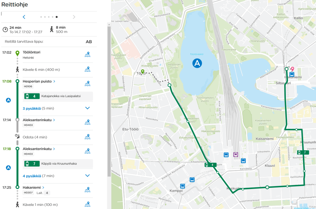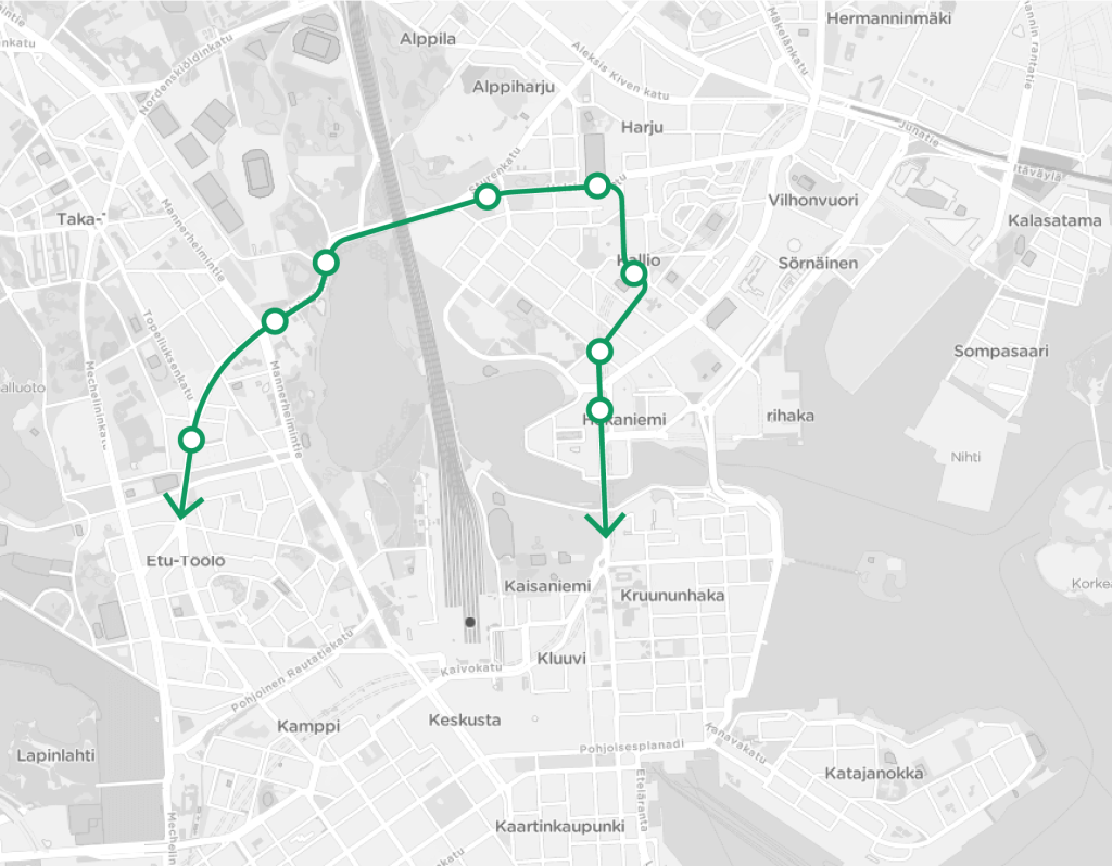 Töölön ja Hakaniemen välillä matkustamisen ei pitäisi olla hankalaa. Hyvän joukkoliikenneverkon pitäisi mahdollistaa sujuvat matkat kaikkien Hakaniemen ja Töölön kokoisten paikkojen välillä. Nykyiset matkat voi tehdä joko Helsinginkadun kautta kulkevalla yhteydellä tai keskustan kautta.