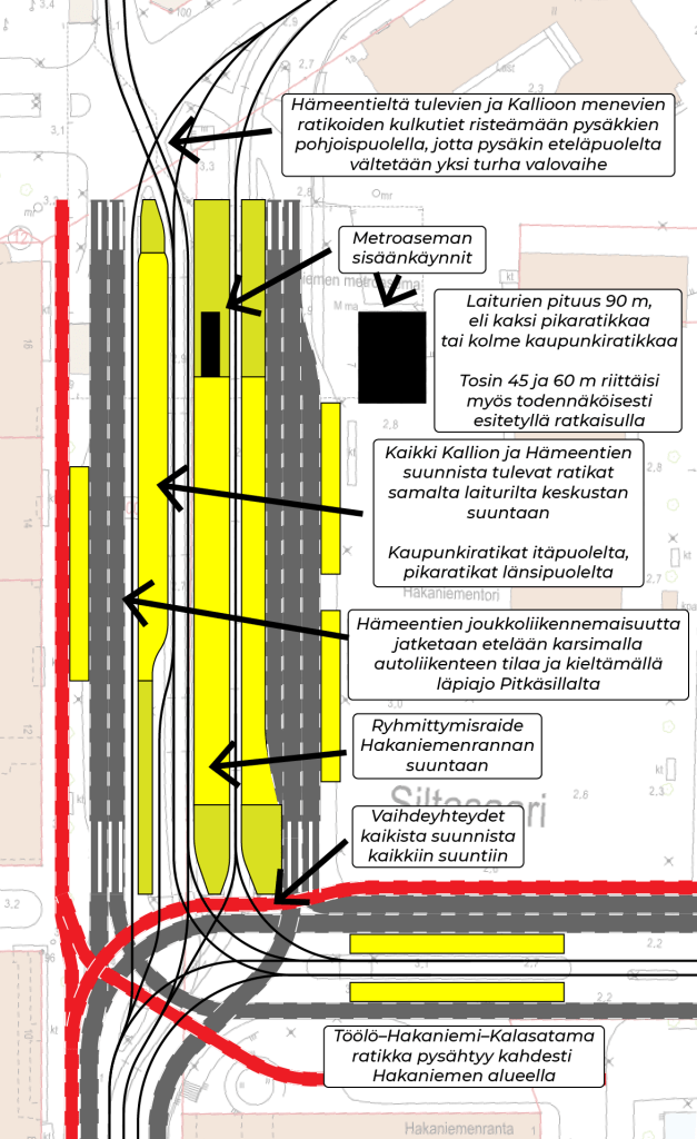 Viemällä keskustan suunnan ratikat samaan laituriin vältämme myös sen nykyisen ongelman, että Hämeentieltä tulevien ja Kallioon menevien ratikoiden kulkutiet risteävät tyhmästi Siltasaarenkadun ja Hakaniemenrannan risteyksessä. Risteämä tuottaa tarpeen muuten ylimääräiselle valovaiheelle. Siirtämällä risteäminen laiturien pohjoispuolelle se solahtaa paljon hienommin osaksi jo nykyisiä valovaiheita.