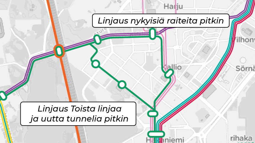 Nykyisellä rataverkolla voisi toki ajaa raitiolinjaa myös Töölön ja Hakaniemen välillä Helsinginkadun ja Kallion ratojen kautta. Tämä kuitenkin johtaa vielä pahempiin linjastollisiin haasteisiin kuin Kaivokadun kautta kulkeva linjaus, koska linjan kummatkin päät pitäisi johtaa jonnekin keskustaan. Linjalle ei ole vapaana kääntöpaikkoja, eikä sillä voi korvata muuta raitioliikennettä. Keskustan rataverkko ylikuormittuisi erillislinjan myötä.