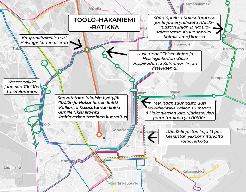 Töölön ja Hakaniemen välille tulisi toteuttaa raitioyhteys Helsinginkadun ja Toisen linjan kautta. Raitiotien toteutus edellyttää vähimmillään uutta vaihdeyhteyttä Hakaniemenrannan ja Kallion raitioratojen välillä. Lisäksi raitiotielle olisi hyvä toteuttaa lyhyt tunneli Helsinginkadulta Toiselle linjalle Kolmannen linjan ja Alppikadun kautta. Jos muut linjastoratkaisut edellyttävät, raitiotielle tulee toteuttaa myös omat kääntöpaikat Kalasatamaan Keskon korttelin ympäri ja/tai linjan länsipäähän.