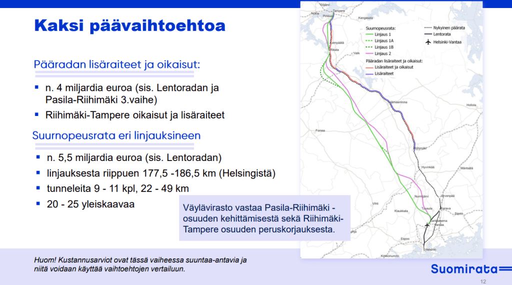 Suomiradan tapauksessa ongelma kertautuu, koska nopeutuneita junayhteyksiä haluttaisiin tarjota myös Poriin, Jyväskylään, Vaasaan ja Pohjois-Suomeen. Jos näiltä alueilta halutaan tarjota nopeita vaihdottomia yhteyksiä Helsinkiin, suurnopeuskalustoa pitäisi hankkia aika paljon liikennöimään enimmäkseen nopeuksilla 200 km/h tai alle. Voimme varmasti olla samaa mieltä siitä, että ei ole mitään järkeä ostaa suurnopeusjunaa Helsingin ja Rovaniemen välille, jos niitä suuria nopeuksia voisi paahtaa vain Vantaan ja Lempäälän välissä. Tämä pitäisi tunnistaa myös hankeyhtiön teettämissä esiselvityksissä, joissa ymmärtääkseni ei ole laskettu suurnopeusjunista aiheutuvaa liikennöintikustannusten lisäystä Tampereen taakse.