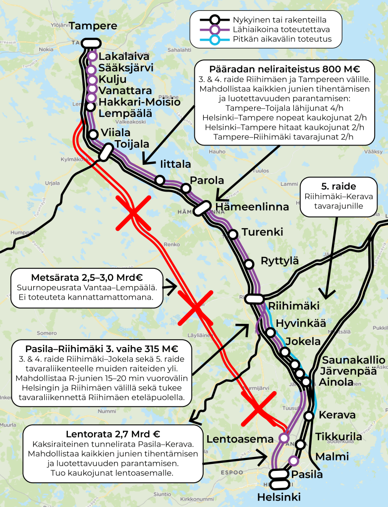 Riihimäen ja Toijalan välillä tarvitaan lisää kapasiteettia, jotta molempia kaukojunia voisi liikennöidä kahdesti tunnissa, tavarajunia voisi liikennöidä päiväsaikaankin ja lähijunia voisi tiivistää kulkemaan edes joka tunti, jos hämäläisillä ei ole tahtoa rahoittaa kahdesti tunnissa kulkevaa lähijunaa.