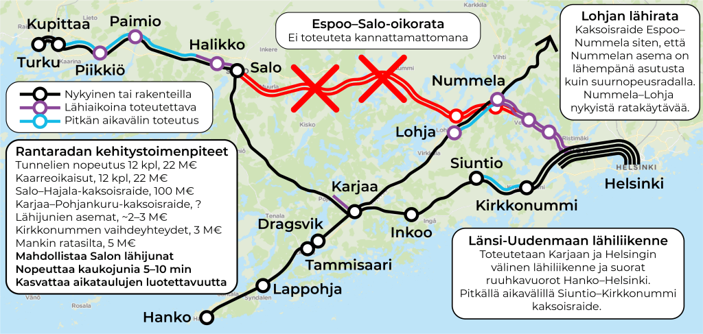 Koonti siitä, miten kehittäisin Turun ja Salon välistä rataosuutta. Espoo–Salo-oikoradan sijaan tulisi toteuttaa Lohjan lähirata, nippu kaarreoikaisuja ja tunnelien nopeutuksia sekä kaksi lyhyttä kaksoisraideosuutta nopeuttamaan junakohtaamisia.
