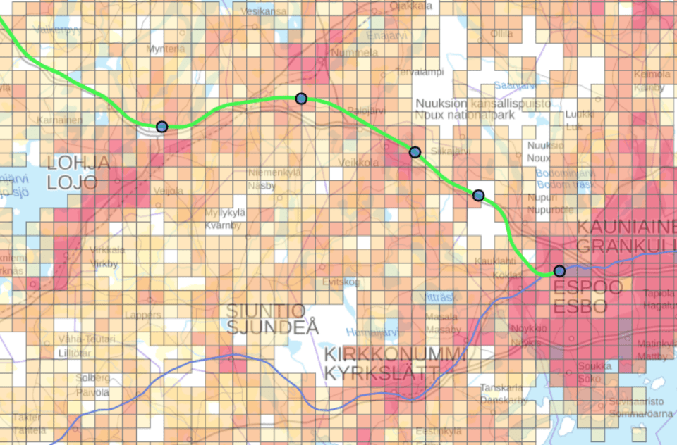 Kuvakaappaus hankeyhtiön karttapalvelusta, jossa on suunnitellut asemat palluroilla ja ruudukossa asukasmäärä neliökilometrin ruuduissa: vaalean värin ruuduissa asuu vähemmän ihmisiä kuin tummemman värin ruuduissa. Uusi rata jää harmillisen sivuun tummemista ruuduista eli sieltä, missä ihmiset asuvat.