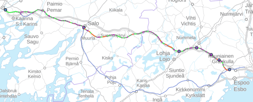 1. Mielenkiintoinen ajatus! Ehdottamasi mallin toteuttaminen vaatisi kuitenkin kohtalaisia investointeja Lohjan ja Karjaan välillä nopeuden nostamiseksi ja kohtauspaikkojen määrän lisäämiseksi. En lähtisi tähän malliin, kun ne kohtauspaikat ja nopeusnostot voisi toteuttaa suoraan nykyiselle radalle. Nykyisen radan luotettavuusongelmien takana ovat juurikin pitkät kohtauspaikkavälit. Uusilla kohtauspaikoilla päästäisiin huomattavasti lähemmäs esim. yksiraiteisen Tampere–Seinäjoki-rataosan luotettavuutta.