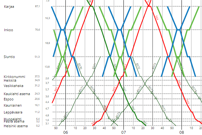 Graafinen aikataulu Karjaan ja Helsingin välille. Sinisillä viivoilla nykyinfran mahdollistamat lähijunat Karjaan ja Kirkkonummen välillä. Vaaleanvihreillä viivoilla Kirkkonummi–Siuntio-kaksoisraiteen mahdollistamat lähijunat Karjaan ja Kirkkonummen välillä. Siniset ja vihreät viivat ovat toisilleen vaihtoehtoisia.
