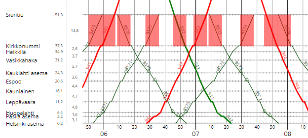 Graafinen aikataulu Siuntion ja Helsingin välille aamuruuhkassa. Punaisilla laatikoilla on korostettu ne ajat, kun Siuntion ja Kirkkonummen välisellä rataosalla on juna.