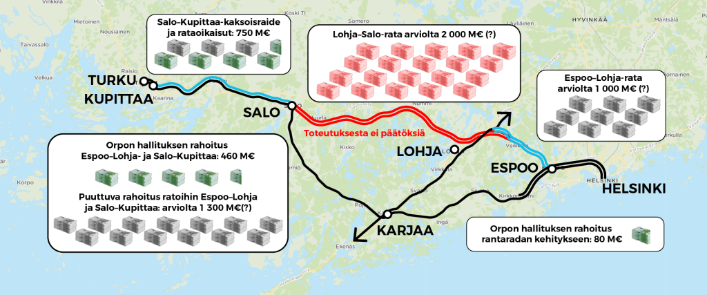 Toisin sanoen oikorata Lohja–Salo ei ole toteutumassa ainakaan tällä vuosikymmenellä, eikä todennäköisesti myöhemminkään. En usko, että tulevilla hallituksilla on yhtään enempää tahtoa maksaa miljardeja oikoradan rakentamisesta kuin tälläkään hallituksella, joka ei saanut kasaan edes puolta miljardia. Seuraavalla hallituksella on jo tarpeeksi vaikeat lähtökohdat, kun rataosuuksien Salo–Kupittaa ja Espoo–Lohja toteuttaminen vaatii vielä yli miljardin kehittämistä jostain taikataskusta.
