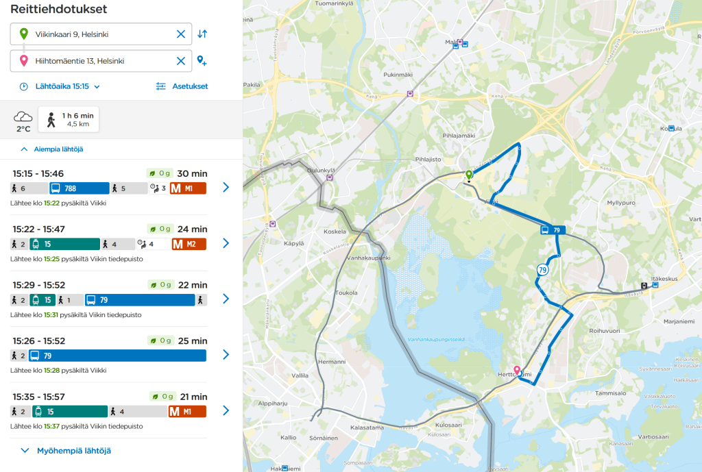 | Herttoniemi–Viikki | 25 min 9,1 km/h | 14 min 16,3 km/h |