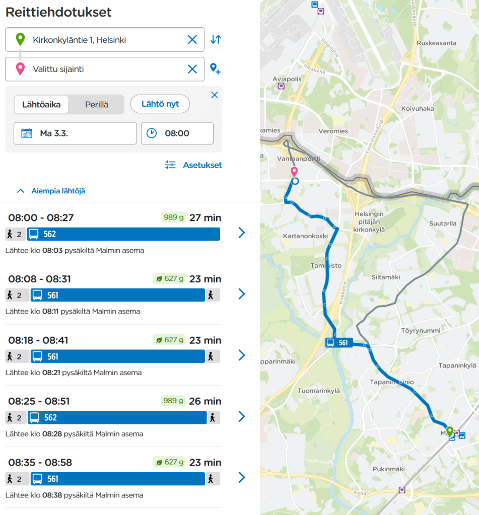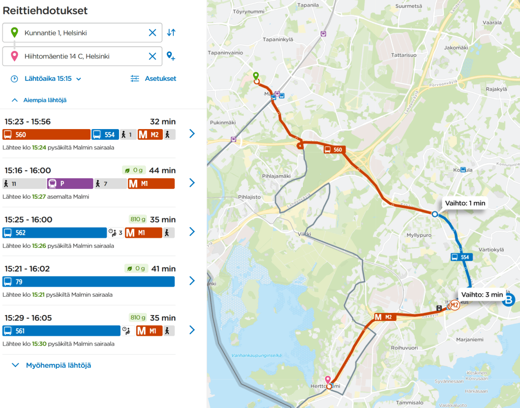 Zoomataan isompaan kuvaan välille Herttoniemi–Malmi. Vaihdoton reitti kestää 41 minuuttia huomioimatta yhtään kävelyminuuttia, ja nopein matkaketju perustuu kahteen 1–3 minuutin tiukkaan vaihtoon.