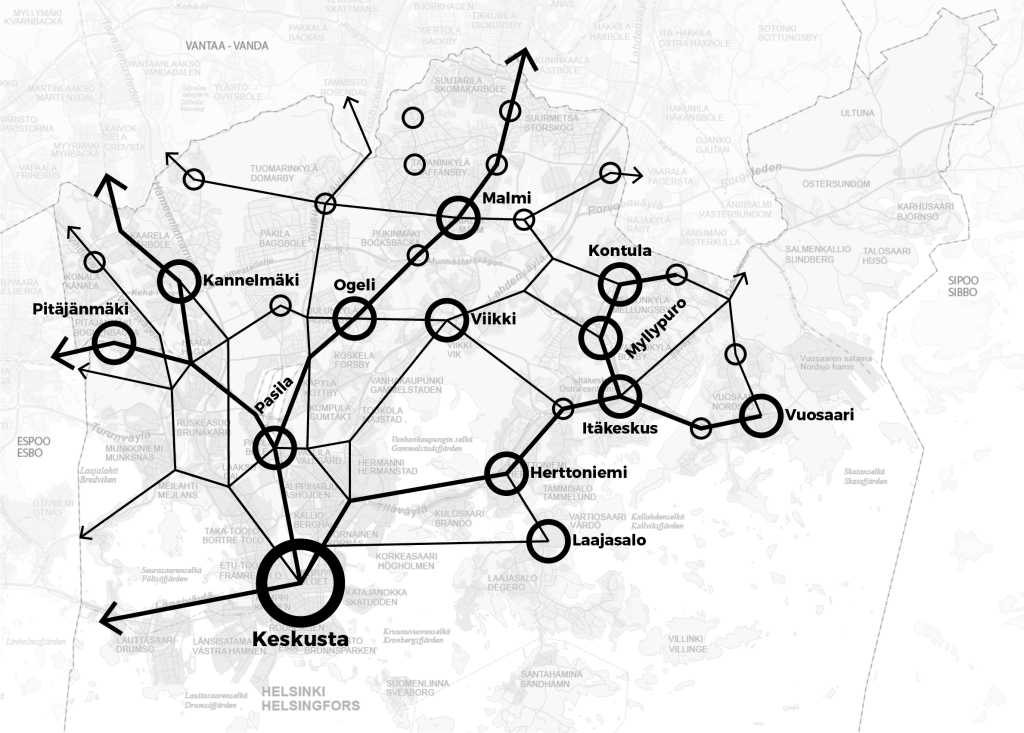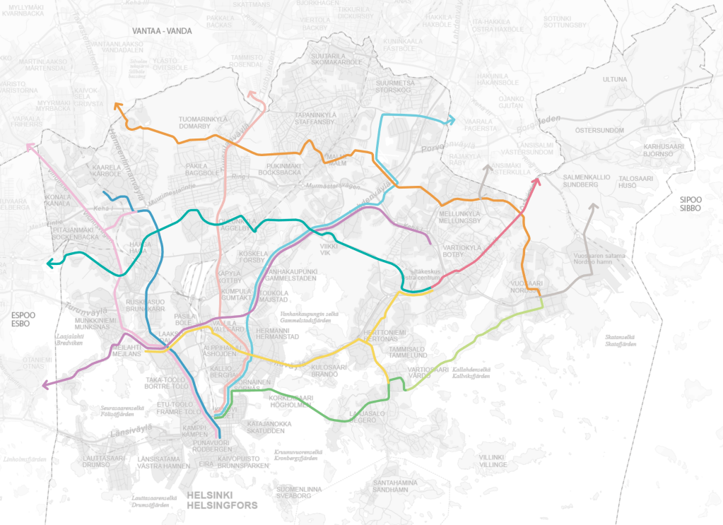 Verkostossa on kuitenkin yksi ammottava aukko kaupunkimme maantieteellisen keskipisteen tienoilla. Kaupunkimme venyy sen verran pidemmälle itään kuin muihin ilmansuuntiin, että säteittäisten ja poikittaisten lisäksi tarvitsemme useampaan ilmansuuntaan kulkevia poikittaisyhteyksiä. Itä–länsi-poikittaislinjojen lisäksi kaupunkimme maantieteelliset keskiosat kaipaavat myös etelä–pohjoissuuntaisia poikittaisyhteyksiä akselilla Herttoniemi–Viikki–Malmi–Vantaa.