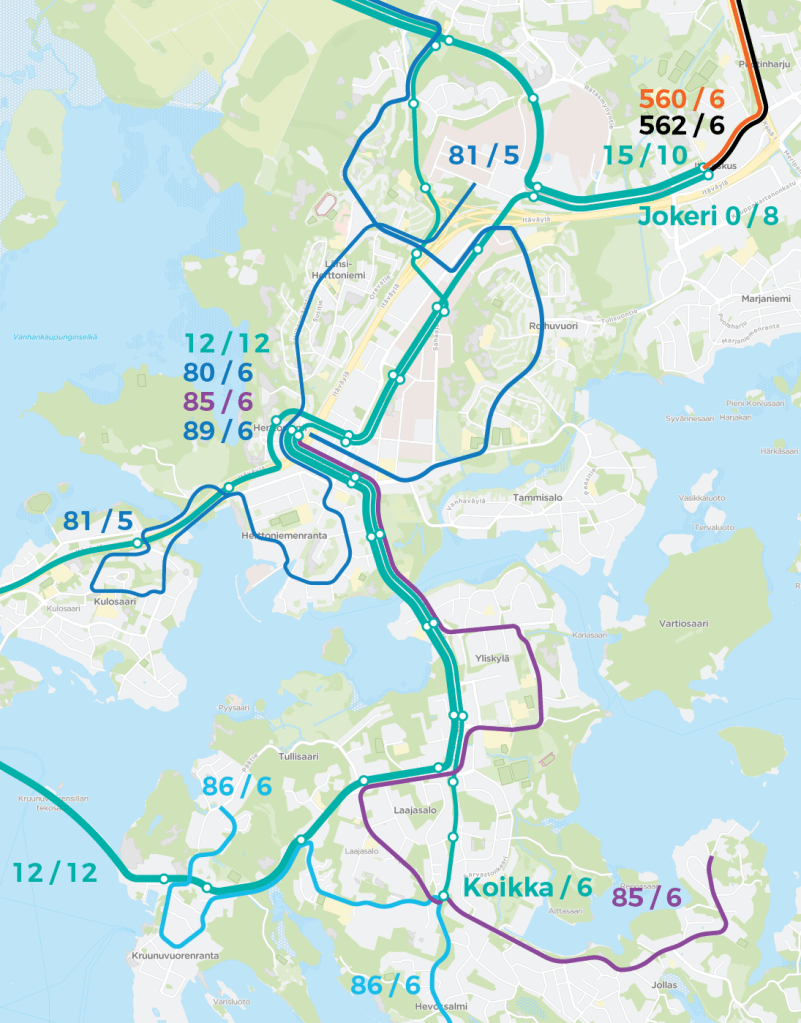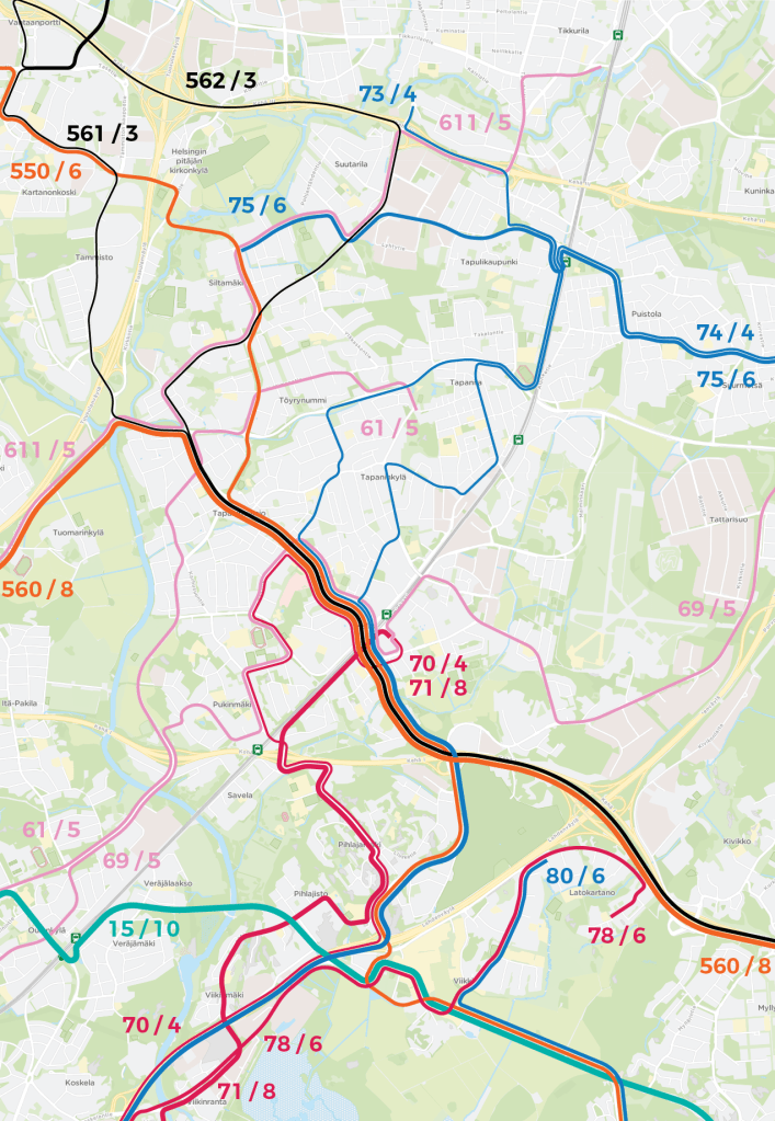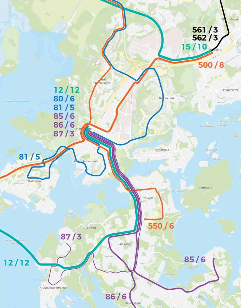 - Nykyinen linjapari 561/562 Itäkeskuksesta, jonka numeron olen kartoissani vaihtanut uudeksi 560-linjaksi