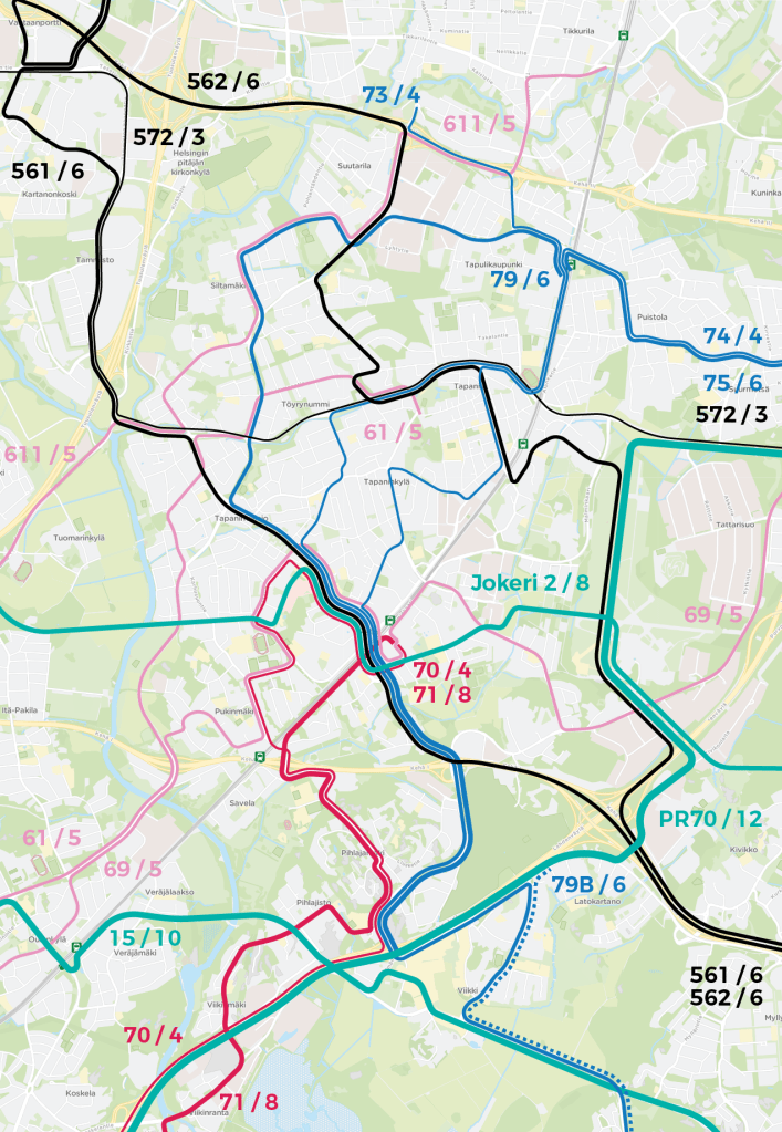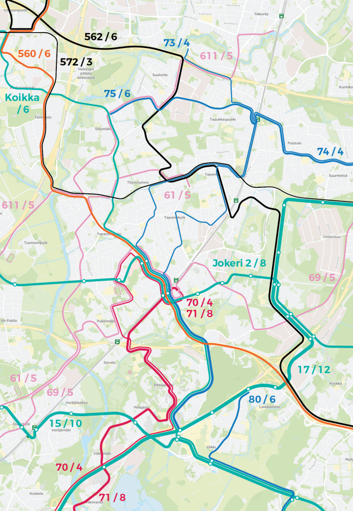 - Vantaan ratikan toteutumisen yhteydessä linjalle 572 on suunniteltu siirtoa Kehä III tasalta Suurmetsäntielle. Lisäksi linjalle 611 on suunniteltu kiertoa Koivuhaan kautta, mutta jälkimmäistä muutosta en ole jaksanut piirtää karttoihini.