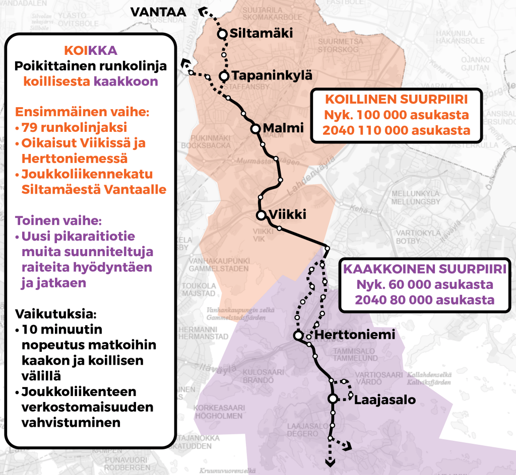 Helsingin koillisen (100 000 as.) ja kaakkoisen (60 000 as) suurpiirien väliset yhteydet ovat nykyisin heikkoja, ja kaipaavat vahvistamista uudella Koikka-runkolinjalla. Erityisesti matkoilla Herttoniemestä Viikin ja Malmin suuntiin nykyiset joukkoliikenneyhteydet ovat tarpeettoman hitaita tai hankalia. Viikin, Malmin ja Vantaan välillä on hyviä suoria yhteyksiä, mutta nykyinen tarjonta kaipaisi keskittämistä yhdelle runkolinjalle linjaston selkiyttämiseksi.