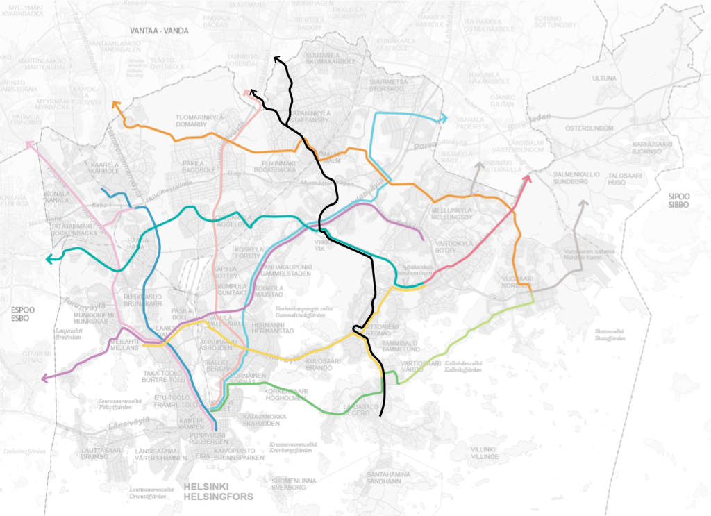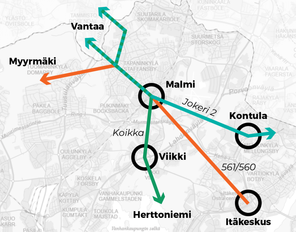 Tämän kysymyksen kanssa voi myös hieman zoomata ulospäin. Malmille tulee Itä-Helsingin suunnasta kolme runkolinjaa:
