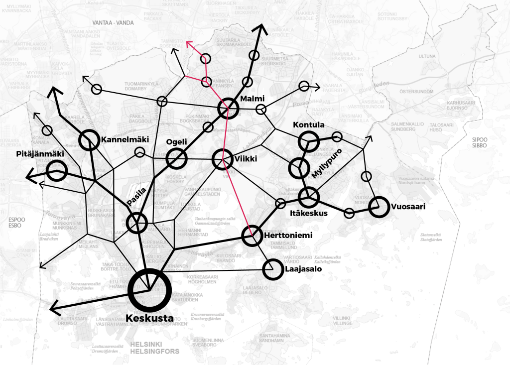 Lisäksi on hyvä huomata, että yleiskaavassa on vain kaksi (lähi)keskusta, joita ei ole suunniteltu minkään raideliikenteen piiriin. Nämä ovat molemmat sattumoisin Malmin pohjoispuolella. Jos Herttoniemi–Viikki–Malmi-linjaa jatkaa pohjoiseen, saadaan nämä Tapaninkylän ja Siltamäen lähikeskukset myös kytkettyä raideliikenteeseen.
