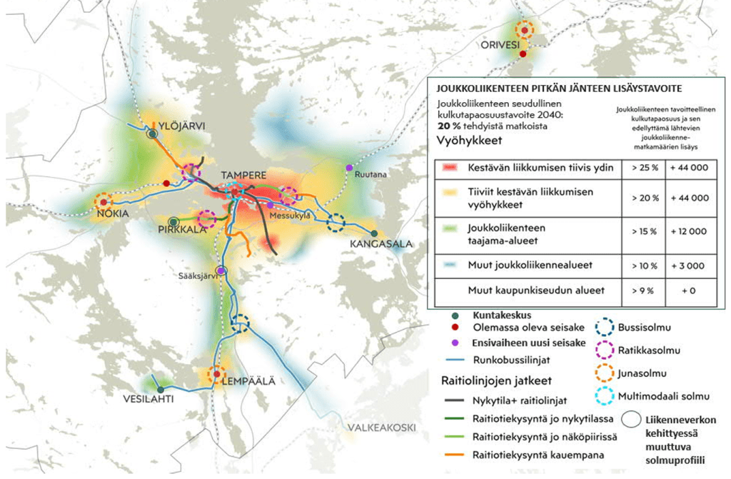 On hyvä muistaa, että kaupunkiseudun vuoden 2012 kehittämisselvityksessä lähijunaliikenteen visiossa 2030+ oli jo puolen tunnin vuoroväli Tampereelta Ylöjärvelle, Nokialle ja Toijalaan sekä tunnin välein Sastamalaan ja Mänttään saakka. Selvitystä moitittiin ilmestyessään jopa kunnianhimottomaksi – sentään sitä ollaan yleisellä tasolla tähän asti kohtuullisen hyvin noudatettu.