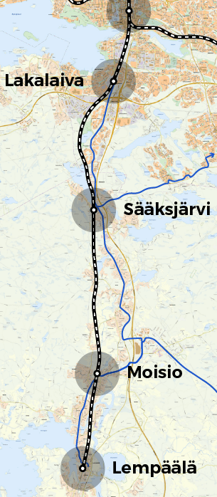 Visioimani uudet seisakkeet ovat Lakalaiva, Sääksjärvi ja Moisio nykyisten Tampereen ja Lempäälän asemien välille. Asemat ovat kohtalaisen harvassa, mikä mahdollistaa nopean seudullisen lähijunaliikenteen.