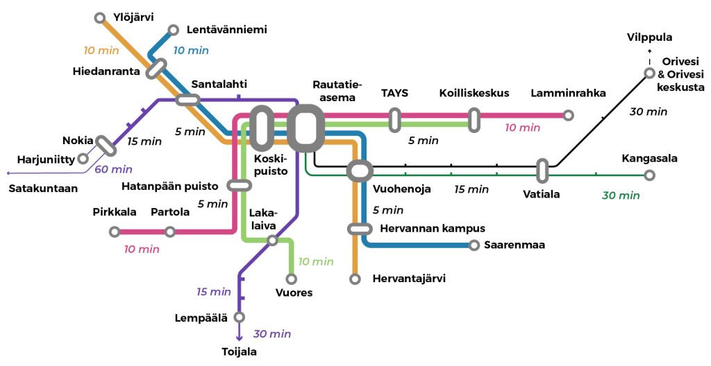 Oriveden ja Kangasalan suunnan lähijunat päätän visiossani Tampereelle, koska niitä ei ole luontevaa jatkaa Nokian suuntaan enkä jatkaisi lähijunia Ylöjärvellekään. Nokian suuntaan jatkamiseksi lähijunien pitäisi ylittää kaikki raiteet Tampereen kannaksella, mikä voi olla haastavaa toteuttaa tiheämmälle liikenteelle. Lisäksi rakenteesta tulee herkästi häiriöherkkä. Ehdotuksellani Tampereen seudun junaliikenne pysyy kahtena erillisenä kokonaisuutena, mikä parantaa järjestelmän häiriösietoisuutta (1. kokonaisuus Nokia-Tampere-Lempäälä lähijunaradan liikenne & 2. kokonaisuus kaukojunaliikenne sekä itäsuunnan lähijunaliikenne).