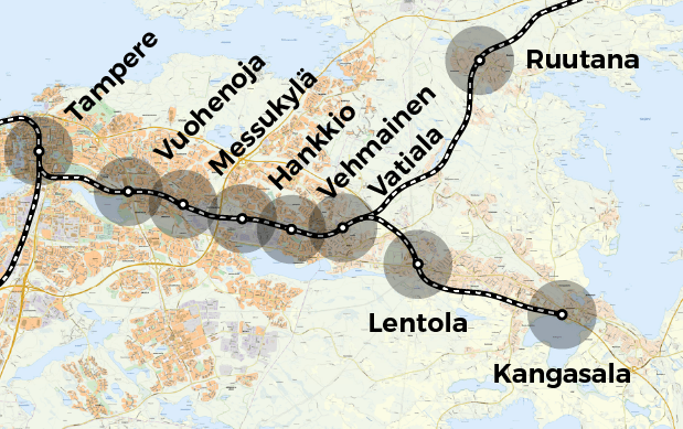 Visioimani uudet seisakkeet ovat Vuohenohja, Messukylä, Vehmainen, Vatiala, Ruutana, Lentola ja Kangasala. Asemat ovat kohtalaisen tiheässä, eli kyse ei ole samanlaisesta nopeasta seudullisesta liikenteestä kuin muilla ratasuunnilla. Ratasuunnan matkustuspotentiaalia en näe niin suureksi, että harvan asemavälin liikenne olisi riittävän kannattavaa. Parempi siis tihentää asemaväliä, jotta saadaan riittävästi matkustajia tavoittelemani 15 minuutin vuorovälin perustelemiseksi.
