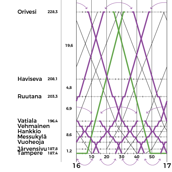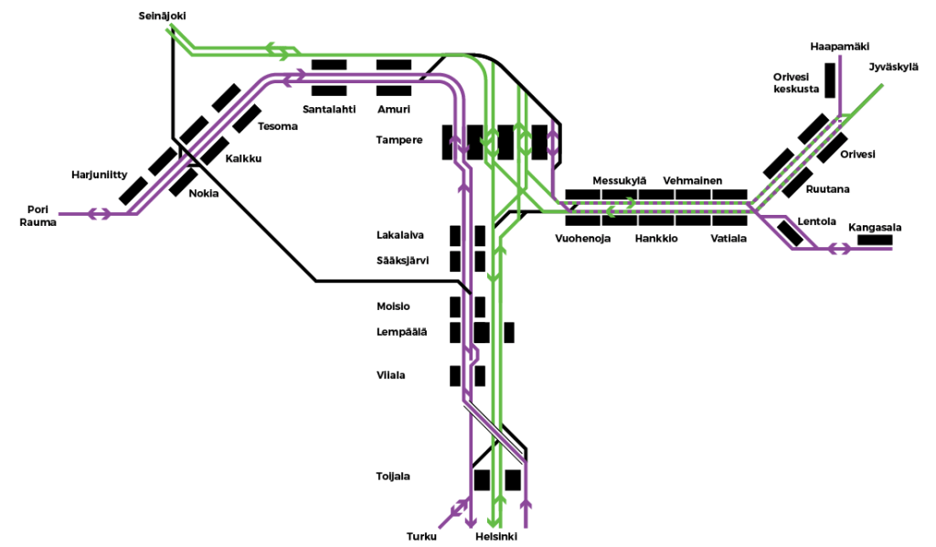 (Suluissa Helsingin ja Turun taajamajunat, oletuksena Helsingin junan kääntö Tampereella puolelta)