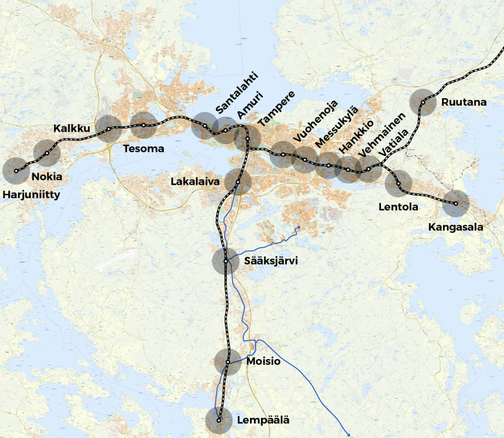 Tampereen kaupunkiseutu kasvaa vinhaa vauhtia ja viime vuosina sen selkärangaksi on alkanut rakentumaan raideliikenne. Raideliikenteen kasvusta on jonkinlaiset sävelet 2040-luvulle asti, mutta pidemmällä aikavälillä visiot ovat vähän hähmäisempiä. Tämä blogi on ensimmäinen osa kahdesta, jossa maalaan oman visioni Tampereen seudun raideliikenteen kehityksestä 2060-tavoitetilanteeseen. Ensimmäinen osa keskittyy lähijuniin ja rataverkkoon.