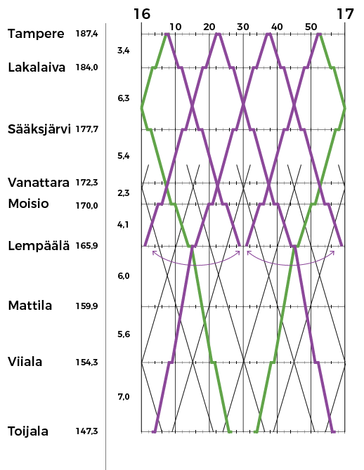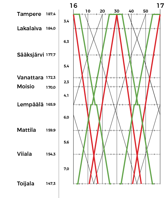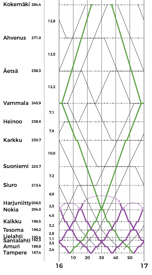 Lähijunaliikenteen käytössä on läntinen raidepari. Aikataulut olen piirrellyt siten, että ne ovat Nokian ratasuunnan kannalta optimaaliset ja toisaalta Toijalassa toteutuu hyvät vaihtoyhteydet eri suuntien välillä.